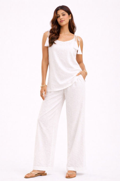 Designed with a waist-length, slightly cropped cut, it pairs perfectly with both plazos and denims for versatile styling. The sleeveless design with tie-up shoulder details adds a subtle, feminine touch, while the straight/square neckline keeps the look minimal and contemporary.